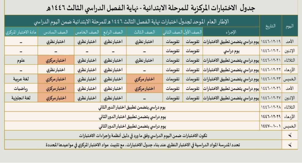 نشرت وزارة التربية والتعليم في المملكة العربية السعودية موعد الاختبارات النهائية الفصل الدراسي الثالث 1446 موضحة جدول الاختبارات المركزية 1446 الفصل الثالث للمرحلة الابتدائية والمرحلة المتوسطة معنلة عن بعض التغيرات لخطة تقديم الاختبارات النهائية