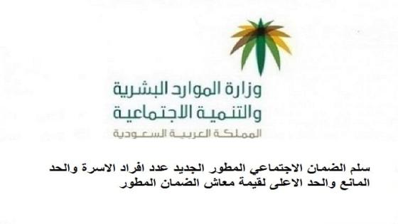 كشفت وزارة الموارد البشرية والتنمية الاجتماعية عن سلم نظام الضمان الاجتماعي المطور الجديد لعدد افراد الاسرة كما حددت الحد المانع لصرف دعم الضمان الاجتماعي المطور والقيمة الاعلى لمعاش الضمان المطور الجديد